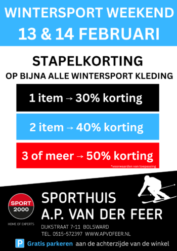 Ben jij je wintersport aan het voorbereiden voor de voorjaarsvakantie? Tijdens het wintersport aanbiedingsweekend bij Sporthuis A.P. van der Feer profiteer je van hoge stapelkorting op bijna alle wintersportkleding.